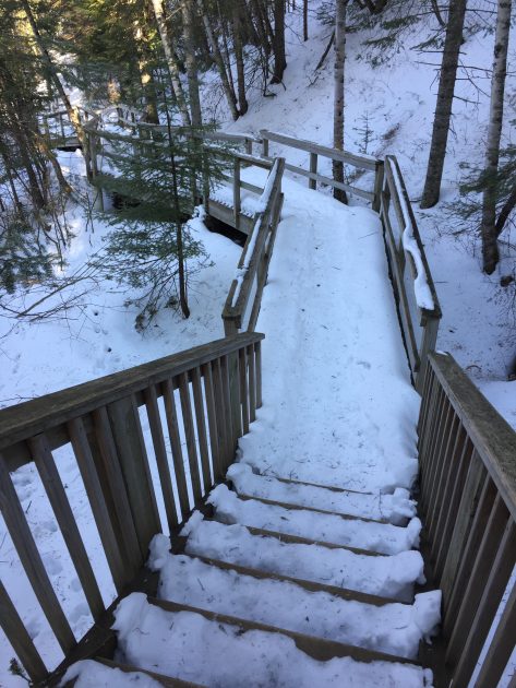 Judge CR Magney State Park was about a 20 minute drive north of Grand Marais. We started at around 9:30 am, assessed the trail quickly and decided that snowshoes were overkill on the packed snow but brought yak tracks and poles. We were glad to have both on the slippery inclines and icy stairs. This park has 9 miles of hiking trails, joins with the SHT and has 27 campsites. The ranger station and campsites were closed for the winter, so we didn’t check those out this time.