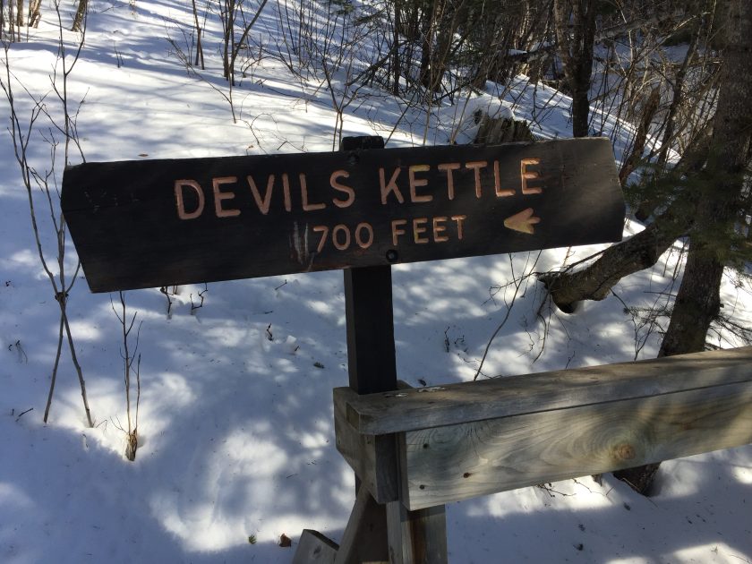 The trail takes you up right away, with views looking down into the Brule River gorge. Once again, we felt like the only ones in the park and choosing to visit in the winter made it a nice and secluded hike. The weather was just starting to warm up, so it couldn’t have been any better. The park seemed to have an unusual number of ravens. They called out across the river with their almost human sounds and were huge. We got a good look at a couple of them and wondered if they too were drawn to the greatest mystery of the park, the Devil’s Kettle.