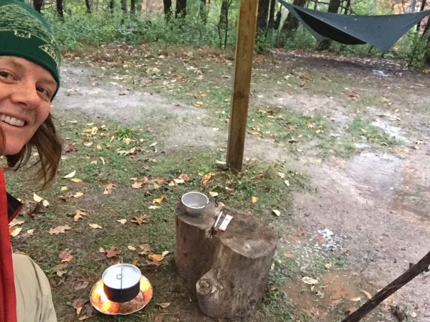 IMG_6708After quilt-rigging and setting up a rain shelter for the morning, I finally ate that free sample Mountain House dinner of chicken and rice cooked on a DIY fancy feast stove.  The stove kept blowing out in the wind, so this morning I stuck some small wood pieces in there and it burned like a champ!