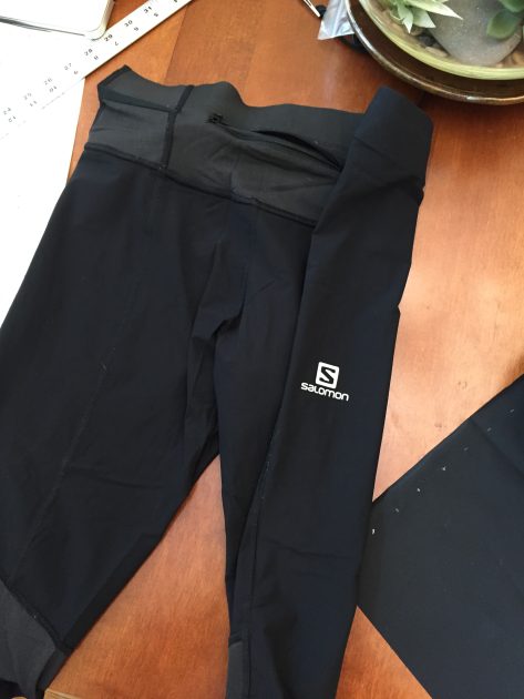 The fabric is upcycled from a pair of Solomon running tights I bought at an REI Garage Sale that ended up being a tad see thru. The fabric was so cool, I kept them and intended to make them into pack strap water bottle holders . If you want to add a bottom pocket to your kit, just cut the fabric to fit the bottom flap before it’s sewn in place and layer it in. Before sewing, I pulled the side that would be the opening a little taut and inserted the stretchy Solomon drawstring into the hem of the pant leg for a drawstring pocket closure. Don’t want those snacks falling out!