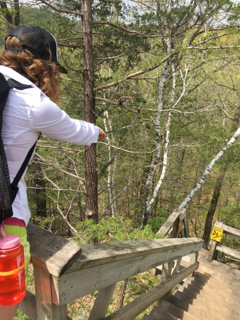 IMG_0495Just after the third overlook, you’ll see the stairs.   These stairs are so steep they are actually marked as a ladder on the yellow warning sign and connect to another couple of long sets of stairs that lead you down to the end of the Hiking Club trail and the parking lot to the campground.  We got a good laugh each time another set appeared and tried not to wipe out.