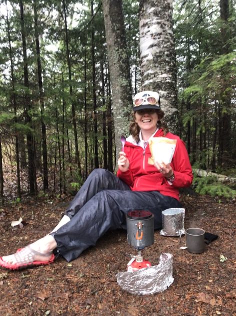 Next, we hobbled down the hill to filter water out of a swamp.  We would find out later that there is a clear beautiful river just to the north. Oops, we’ll stop there in the morning.  We ate dinner, sitting in the mud in our rain suits under some pine boughs and kind of had a chuckle at our soggy selves.