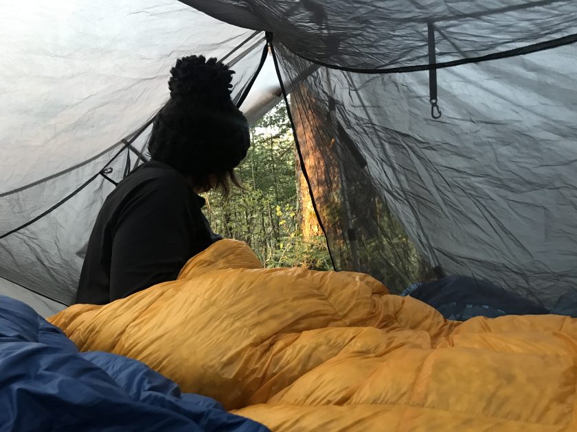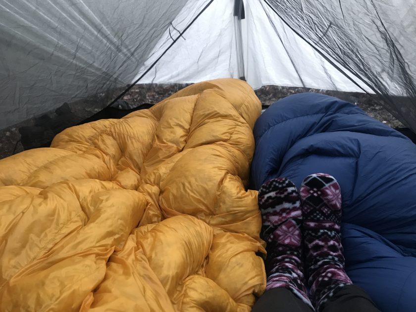 We were so tired, we headed to bed right after dinner.   It was only 7pm, but it felt like bed time.   Everything was damp but the tent was warm and were nice and snug in our puffy jackets and Enlightened Equipment quilts.