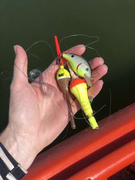 On the water – most trash consisted of food packaging in shoreline fishing spots, floating micro trash, bait packaging and tackle. Unfortunately, sometimes people can’t get their fishing gear unstuck and just have to ditch it (I’ve been there!). But those hooks and fishing line are harmful to both humans and wildlife, so they need to come out. I started carrying a pocket knife in my pfd to cut the bobbers and lures out of branches and tight spaces; throwing away the tangled lines and giving the usable tackle to anyone who was fishing on the lake that day. It felt good to get those hard to reach items cleaned up and I got to help a few fishermen save their hooks.